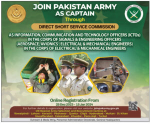 The Pakistan Army has officially opened online registrations for the Direct Short Service Commission (DSSC) Jobs 2024, and eligible male candidates from across Pakistan are invited to apply through the official website: https://www.joinpakarmy.gov.pk/. The available positions include Army Education Officer, Law Officer, Psychologist, and Remote Veterinary and Farm Officer. The online registration period is set to take place from December 25, 2023, to January 15, 2024. Prospective applicants must meet the qualification requirement of a BS/BE in Engineering. Interested candidates are encouraged to visit the official website for detailed information and to complete the online application process.